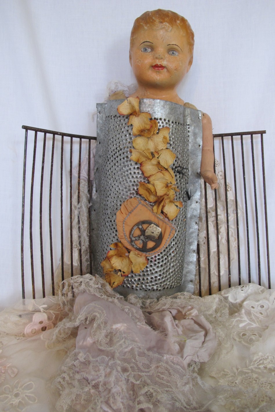 vintage lace, silk purse, dried flowers, vintage doll, old grater, old grill top, gear, vintage watch face