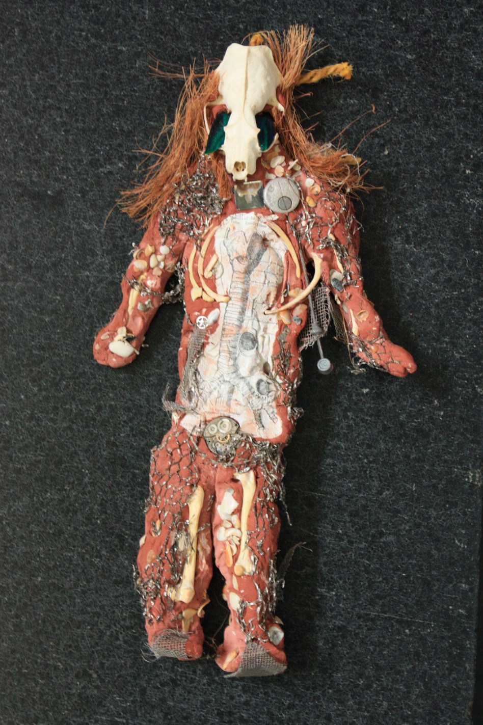 mixed media: clay, seashells, illustrations from vintage dictionary, bones, beetle wings, watch parts, screen, burlap, rope, skull