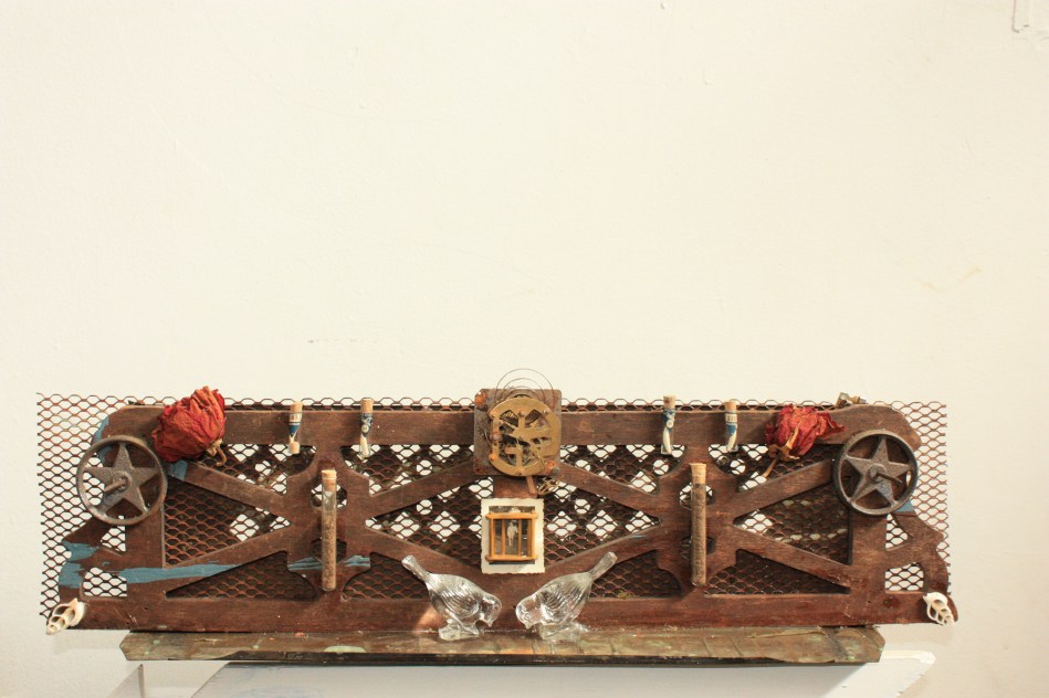 dried flowers, glass birds, old photo, vintage glass vials, bones, dirt,
